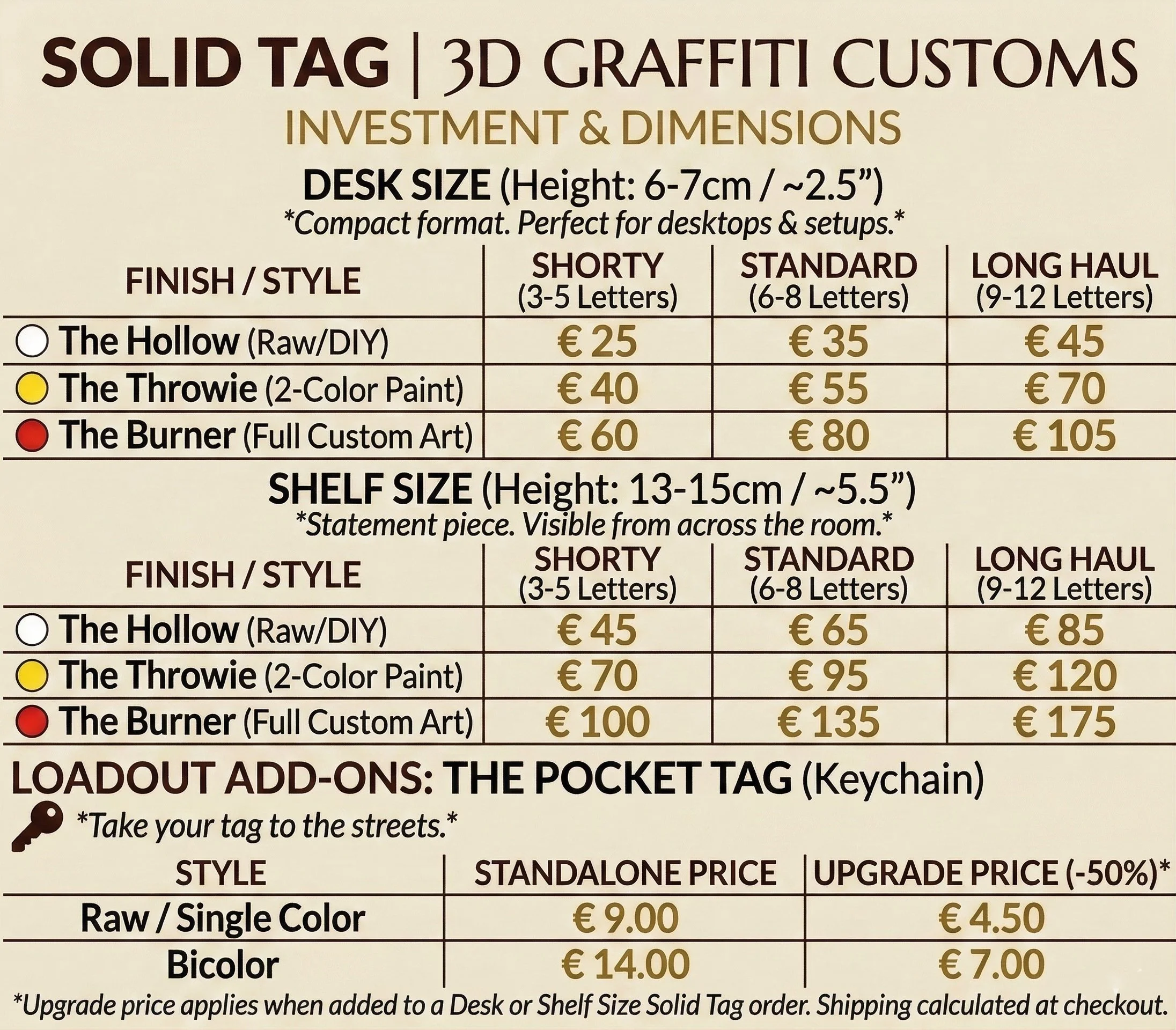 Ditch the flat paper and digital fonts. This is where your tag, crew name, or alias gets pulled off the wall and dropped into the third dimension. We 3D-print your custom graffiti in solid, tactile form. Whether you want a raw piece to paint yourself or a fully customized, hand-painted masterpiece, we craft the ultimate street art statement for your space. No mass production. Just your name, built solid.