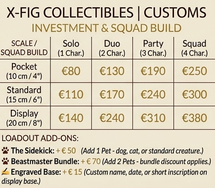 THE PROTOCOL: Secure your slot using the commission form below. Pick your scale, lock in your party size, upload your reference photos, and let the X Factory lab craft your custom collectible.